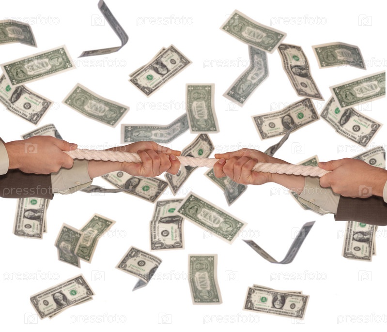 Мужские руки тянут канат на фоне летящих долларов