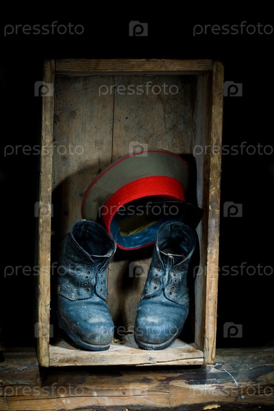 Старые сапоги и фуражка в коробке