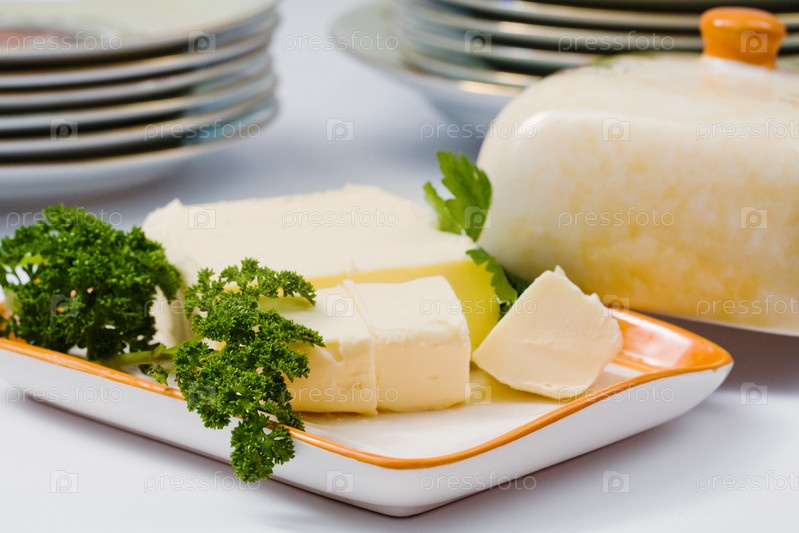 Свежее масло на тарелке с зеленью петрушки