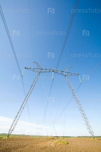 Линия электропередачи высокого напряжения на фоне голубого безоблачного неба