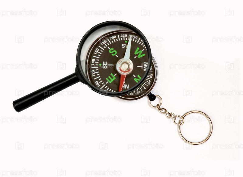 Лупа и компас на белом фоне