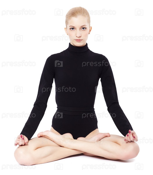 Портрет молодой светловолосой гимнастки, сидящей в позе лотоса
