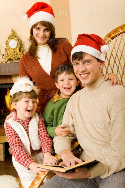 Семья собралась вместе у камина перед Рождеством и читала книгу