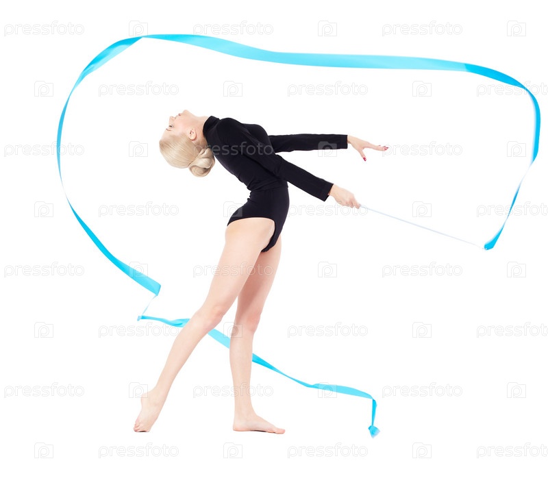 Красивая гимнастка на тренировке с голубой лентой на белом фоне
