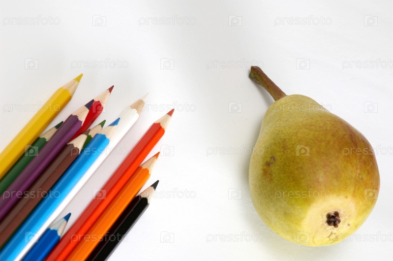 Цветные карандаши и желтая груша на белом фоне