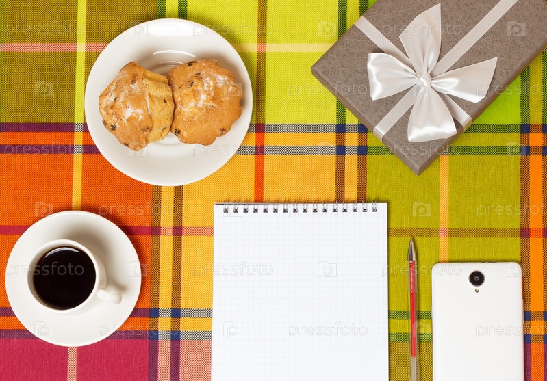 Подарок, кофе, кексы и блокнот