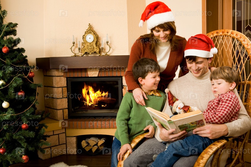 Портрет дружной семьи, глядящей на интересную книгу в Рождественский день