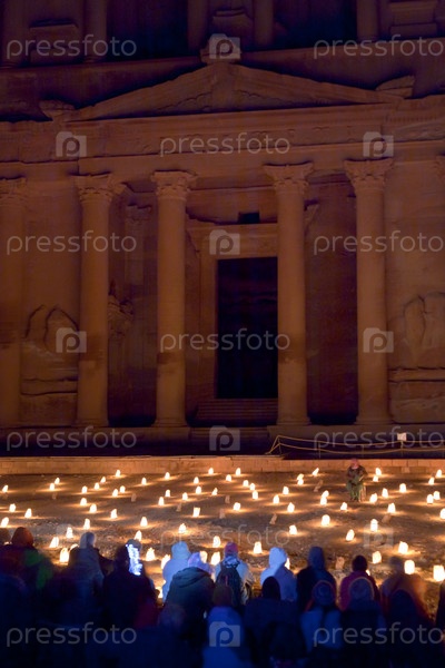 Храм Эль Хазнех в городе Петра в ночное время, Иордания