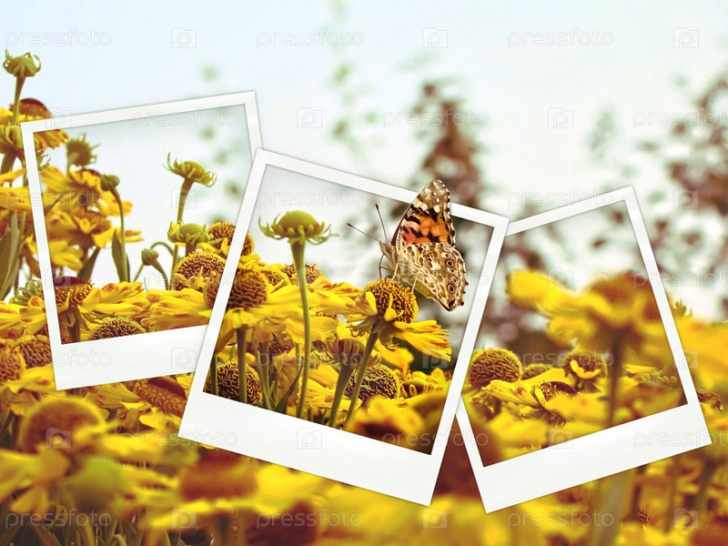 Коллаж из фотографий с цветами и бабочкой