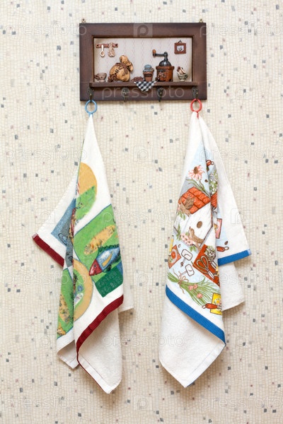 Посудочные полотенца вешали на деревянную шляпу на фоне серной обои