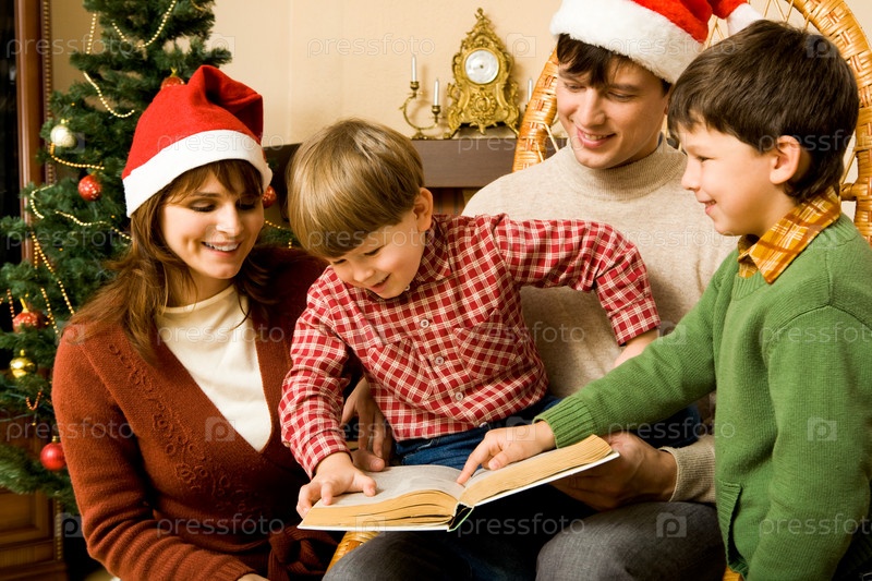 Изображение членов семьи, читающих сказки вместе дома