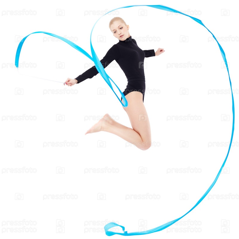 Портрет красивой гимнастки, прыгающей с голубой лентой на белом фоне