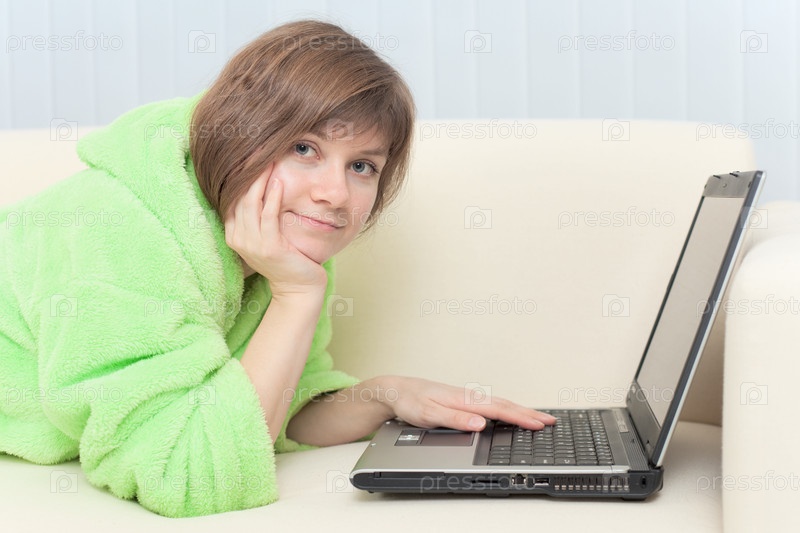 Портрет красивой модной девушки в халате с ноутбуком