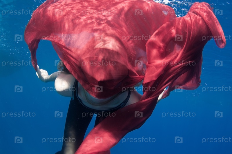 Молодая девушка с красной тканью под водой играет дурака
