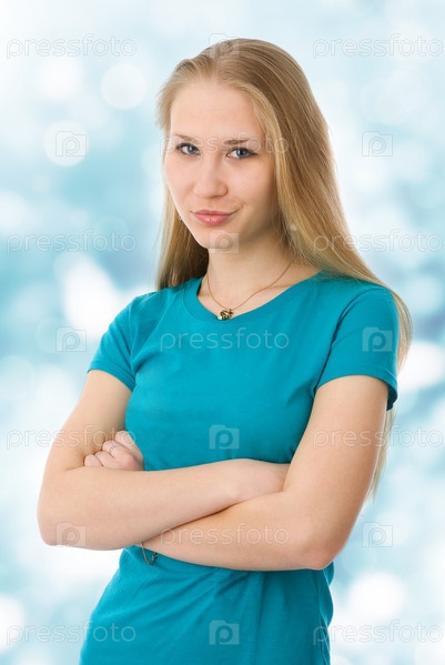 Красивая девушка на голубом расфокусированном фоне