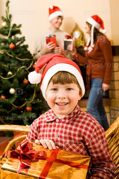 Счастливый парень с подарком в руках, смотрящий на камеру с улыбкой в Рождественский день