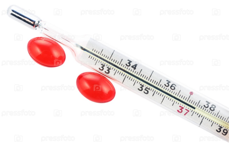 Термометр ,показывающий температуру в 37,5 градусов и две красных таблетки на белом фоне