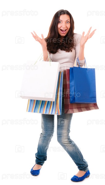 Молодая девушка с покупками в руках на белом фоне