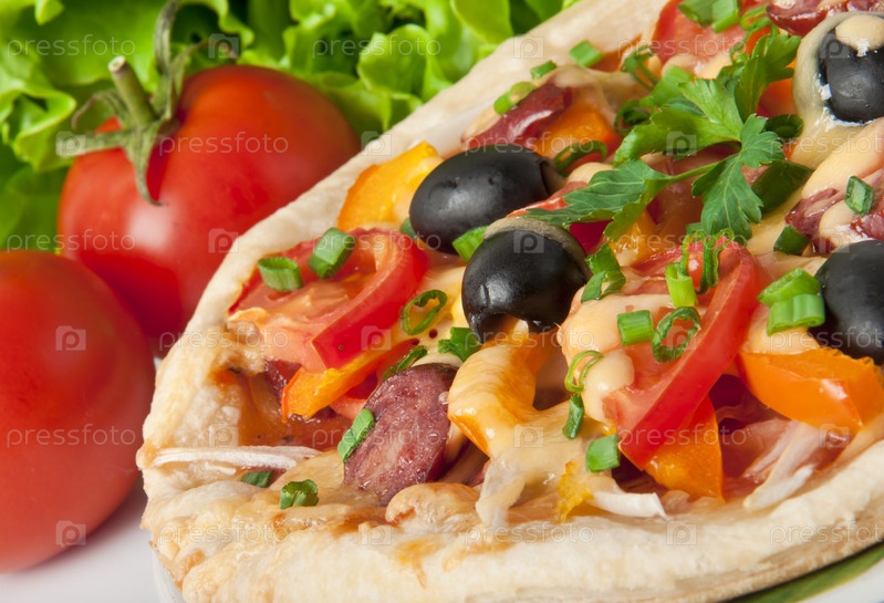 Пицца с помидорами, сыром, черными оливками и перцем