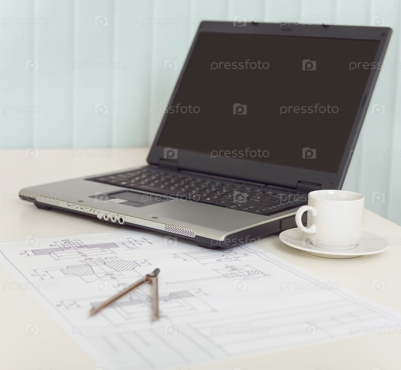 Бизнес натюрморт на столе с ноутбуком, циркулем и схемой