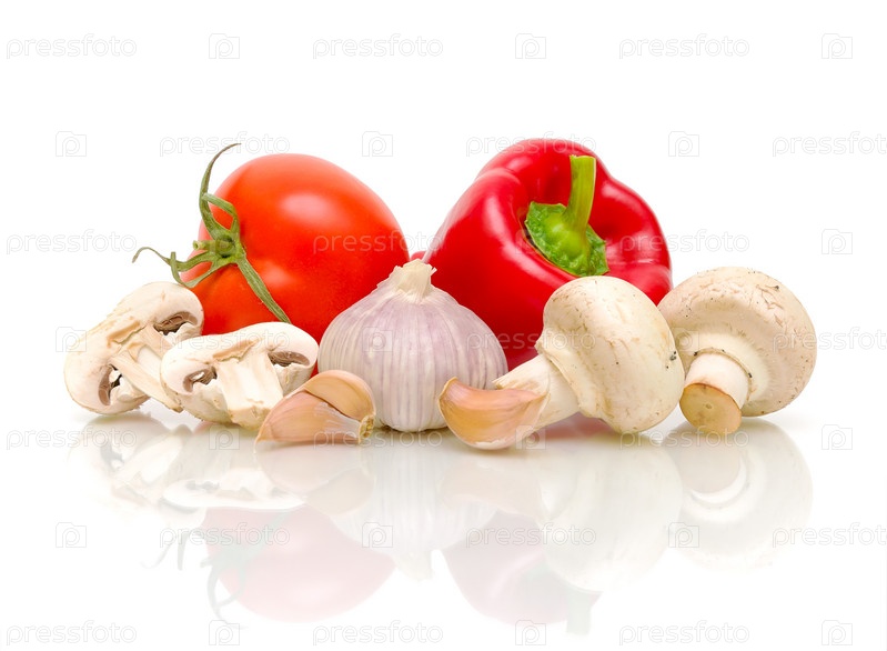 Свежие овощи и грибы на белом фоне