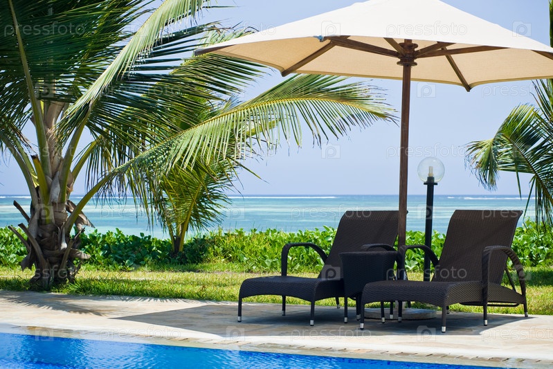 Два лежака у бассейна с пальмами