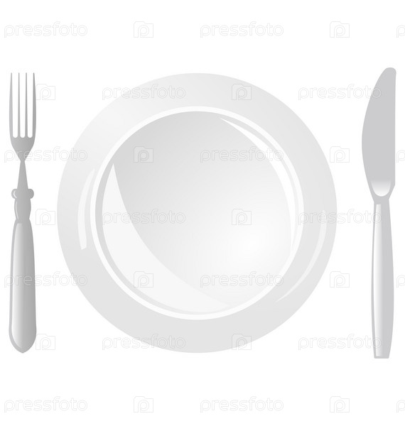 Тарелка, нож и вилка на белом фоне