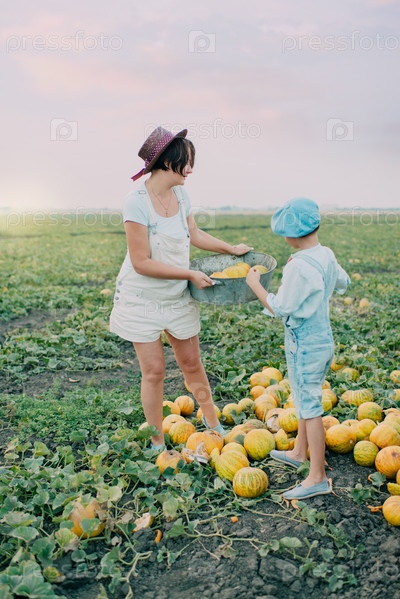Мама и сын на поле с дынями