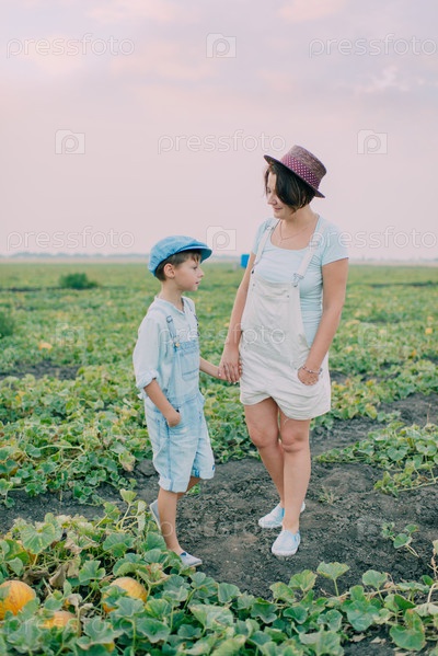 Мама и сын на поле с дынями