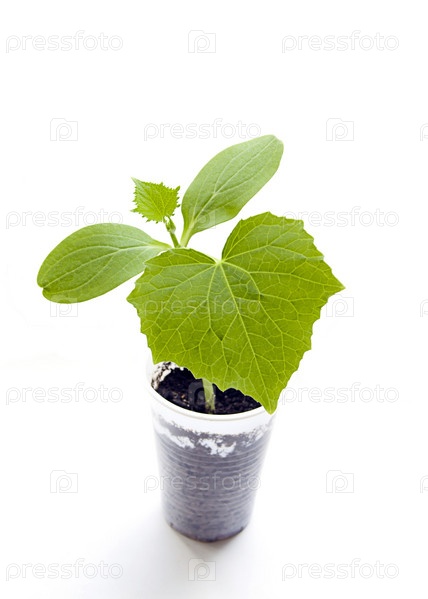 Зеленый росток огурца в пластиковом стаканчике на белом фоне