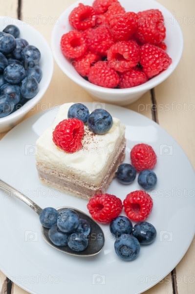 Свежая малина и черника с пирожным