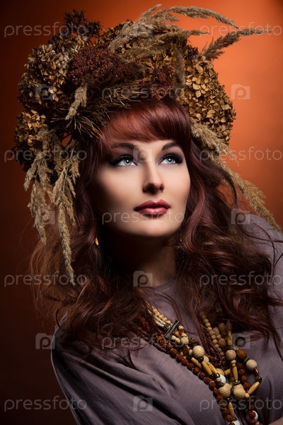 Красивая молодая женщина с сухими цветами на голове