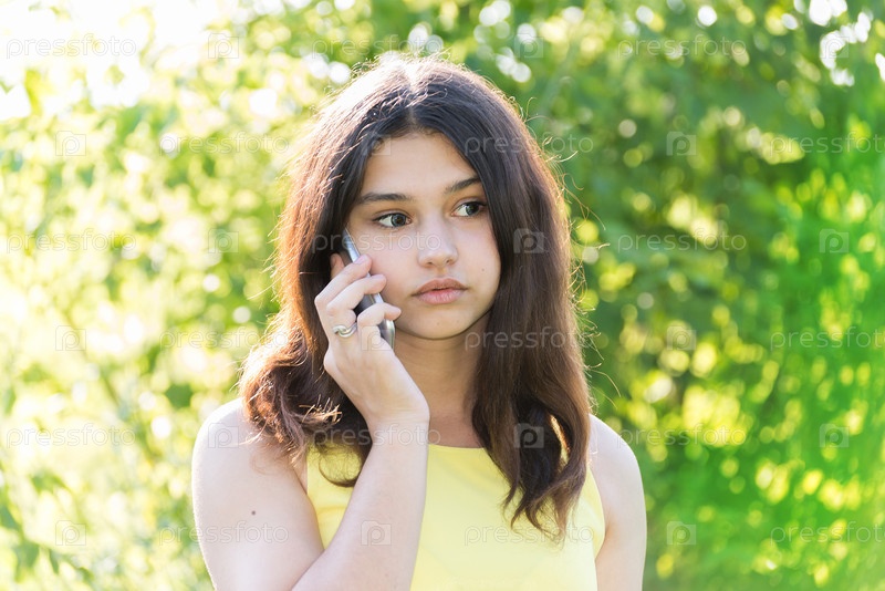 Грустная девушка разговаривает по телефону в парке