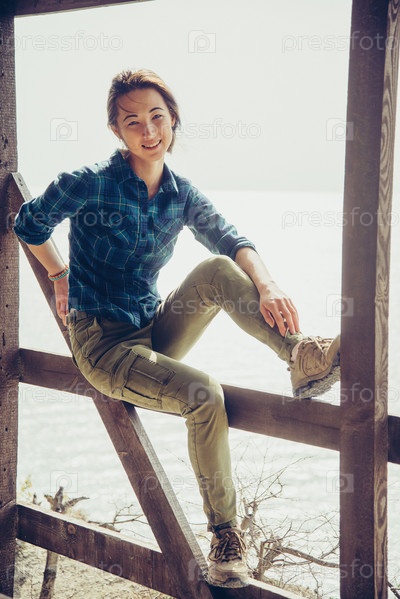 Улыбающаяся девочка, сидя на веранде