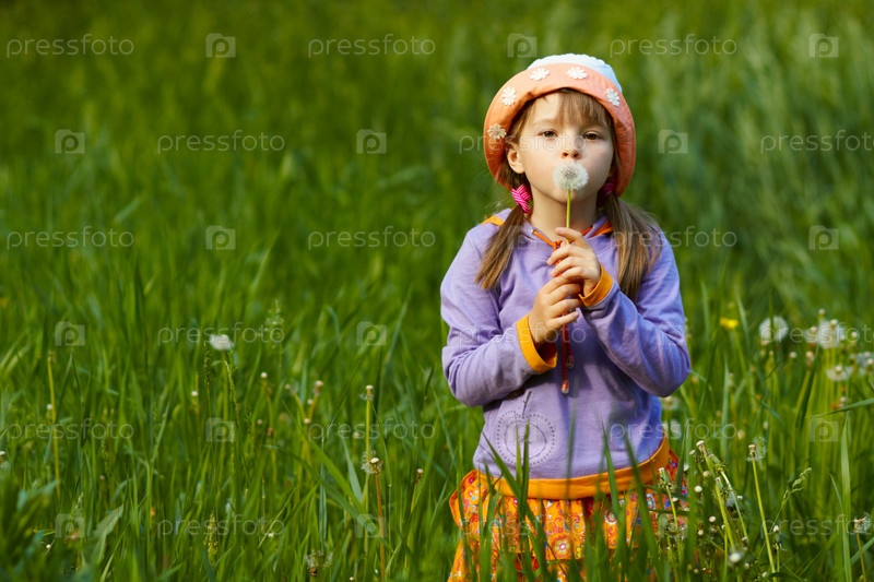 Маленькая девочка с одуванчиком в поле