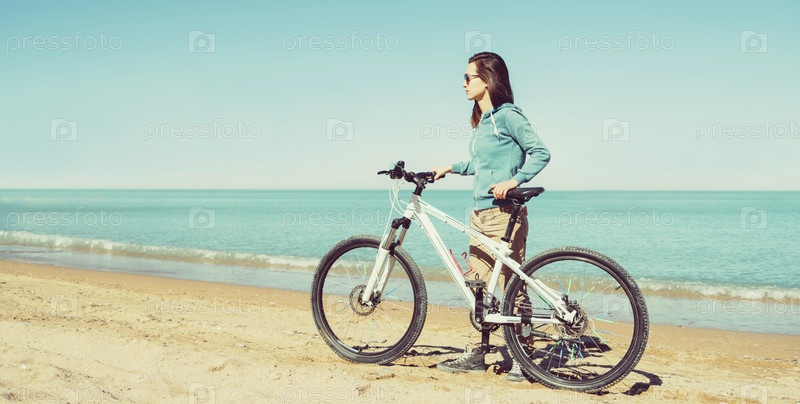 Девушка с велосипедом на пляже