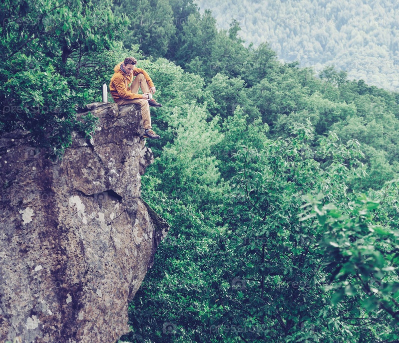 Путешественник, сидя на вершине скалы