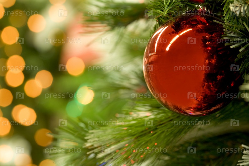 Макро изображение красного игрушечного мяча, висящего на ветке рождественской елки