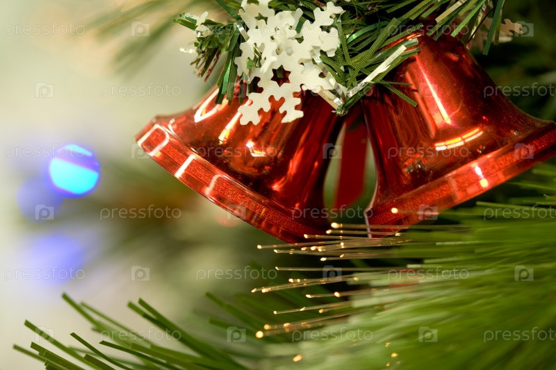 Близкий план красных игрушечных колокольчиков, висящих на зеленой ветке елены, украшенной бумажной снежинкой