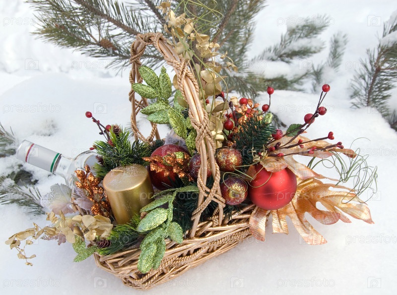 Новогодний подарок в корзине на снегу