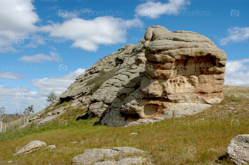 Каменный валун в степи на фоне неба