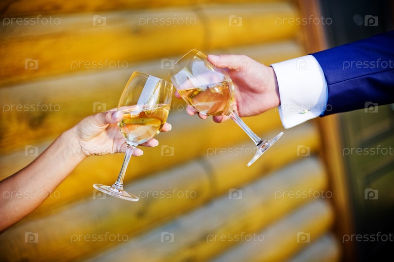 Бокалы с вином в руках жениха и невесты