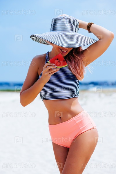 Женщина на пляже с арбузом