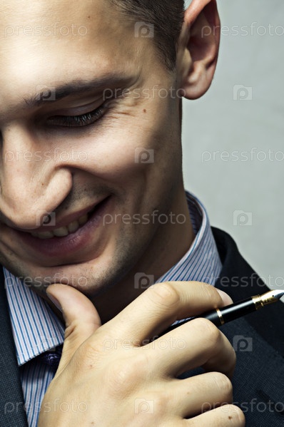 Улыбающийся успешный бизнесмен с ручкой