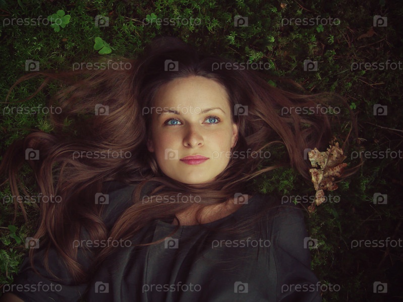 Портрет девушки, лежащей на зеленой траве