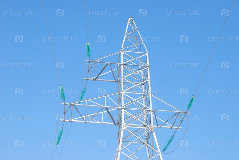 Фрагмент опоры высоковольтной линии электропередач (ЛЭП) на фоне голубого неба