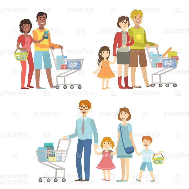 Семьи с тележками в супермаркете