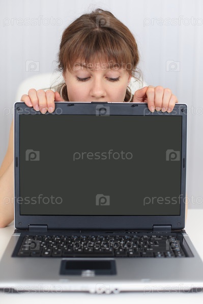 Девушка смотрит из-под черного экрана ноутбука