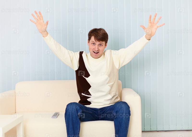 Молодой парень смотрит телевизор и болеет за любимую команду