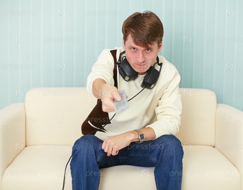 Парень сосредоточенно переключает телевизионные каналы, сидя на диване